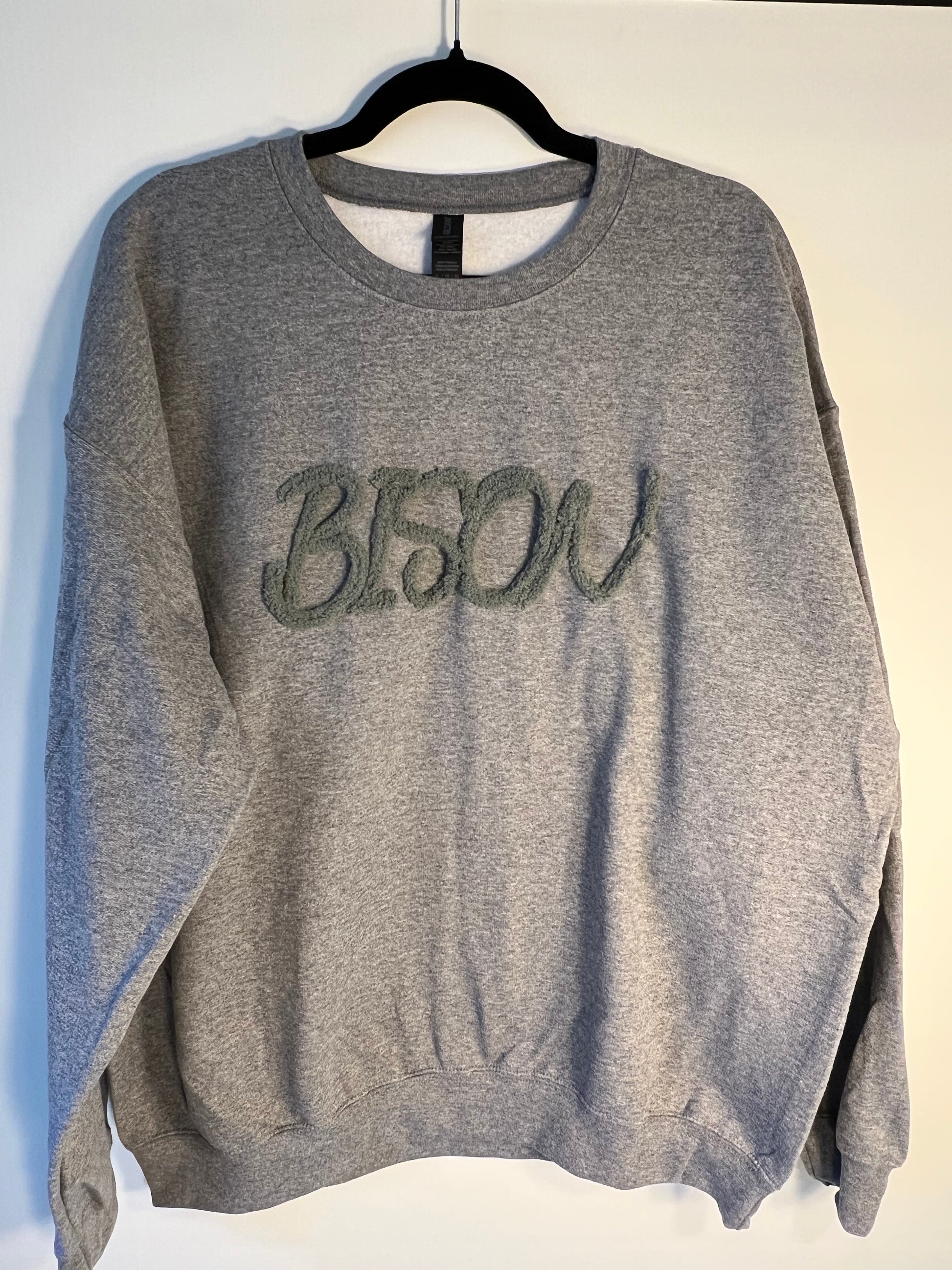 Elevate your wardrobe with this Bison crew sweatshirt. The unique yarn-textured lettering sets it apart from ordinary apparel, giving you a distinctive look that captures attention.